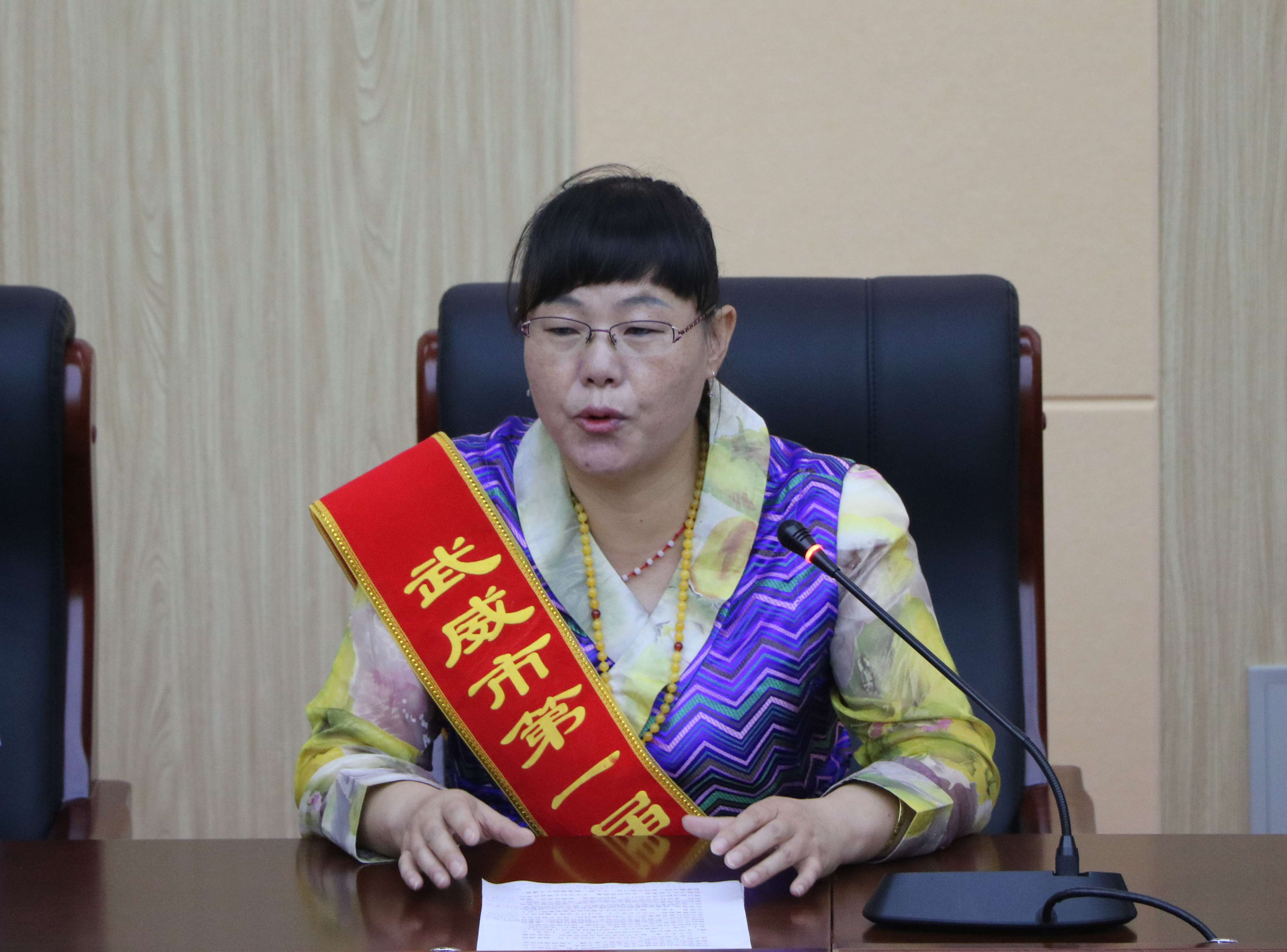 第一届武威市文明家庭成员甘肃武威肿瘤医院医保科副主任阿丽花宣讲了自己长期照料因病截瘫丈夫和身患癌症的婆婆不向命运屈服,勇敢地承担起家庭的重担,不忘服务社会的感人事迹