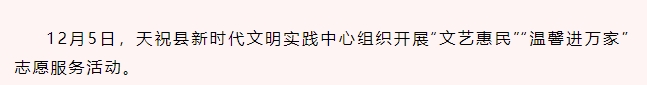 文体旅游志愿服务队组织文艺志愿者到炭山岭镇开展“送戏下乡”文艺演出活动,为群众带去了精彩纷呈的节目。时代新风传播志愿服务队组织志愿者深入松山镇华吉塘村开展“温馨进万家”志愿服务活动,为53户困境家庭赠送大米、面粉等生活用品。