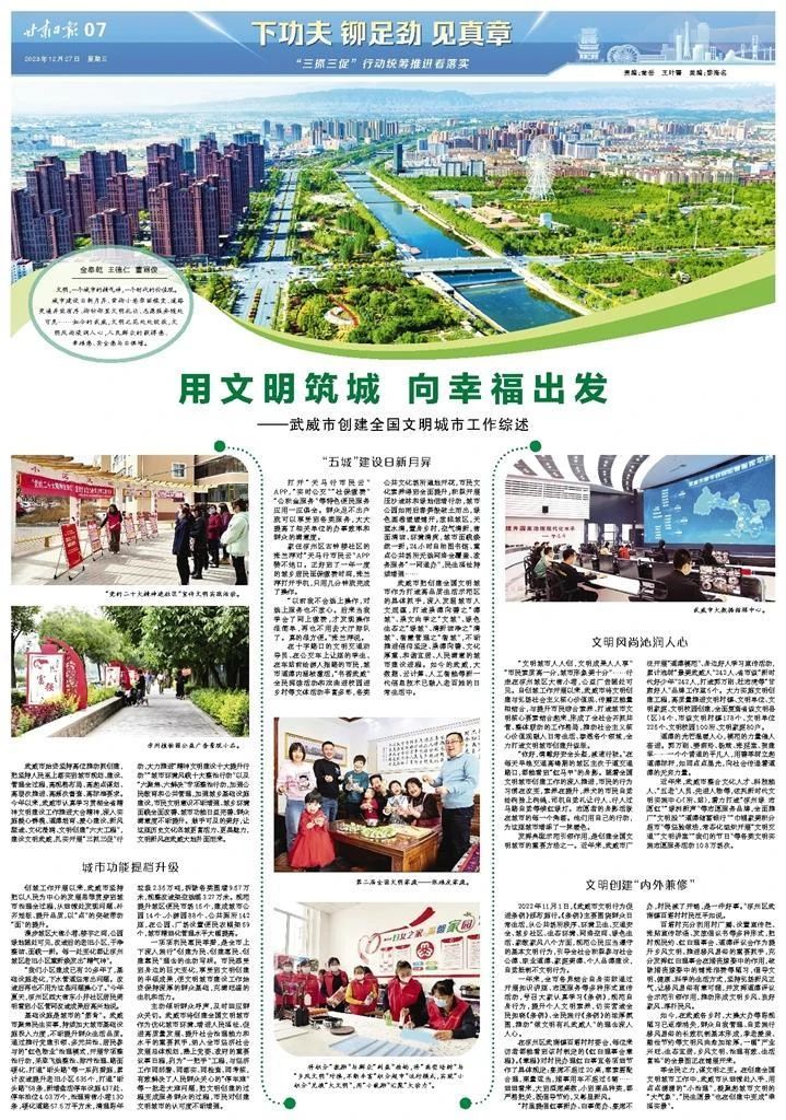 举全民之力,谋文明之变。在创建全国文明城市工作中,武威市从细微处入手,用点点滴滴的“小治理”,凝聚起城市文明的“大气象”,“民生愿景”也在创建中变成“幸福实景”。