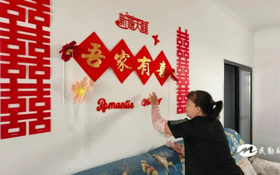 来到上泉村五社村民魏玉家中,大门上的红色对联格外引人注目,上面写着美满良缘百年合,幸福佳偶同心结,寄托着对女儿新婚的美好祝愿。屋内,墙上贴着红色字,喜庆摆件随处可见,无不彰显着浓浓的喜庆氛围,而魏玉脸上洋溢的笑容,更是对移风易俗工作最好的肯定。